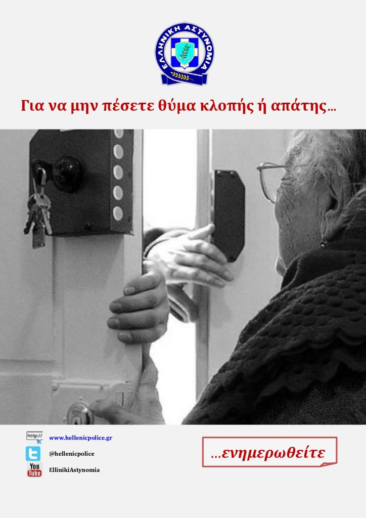 • Να είστε ιδιαίτερα επιφυλακτικοί σε άγνωστα άτομα που επιχειρούν με διάφορα προσχήματα και τεχνάσματα να εισέλθουν στην οικία σας.