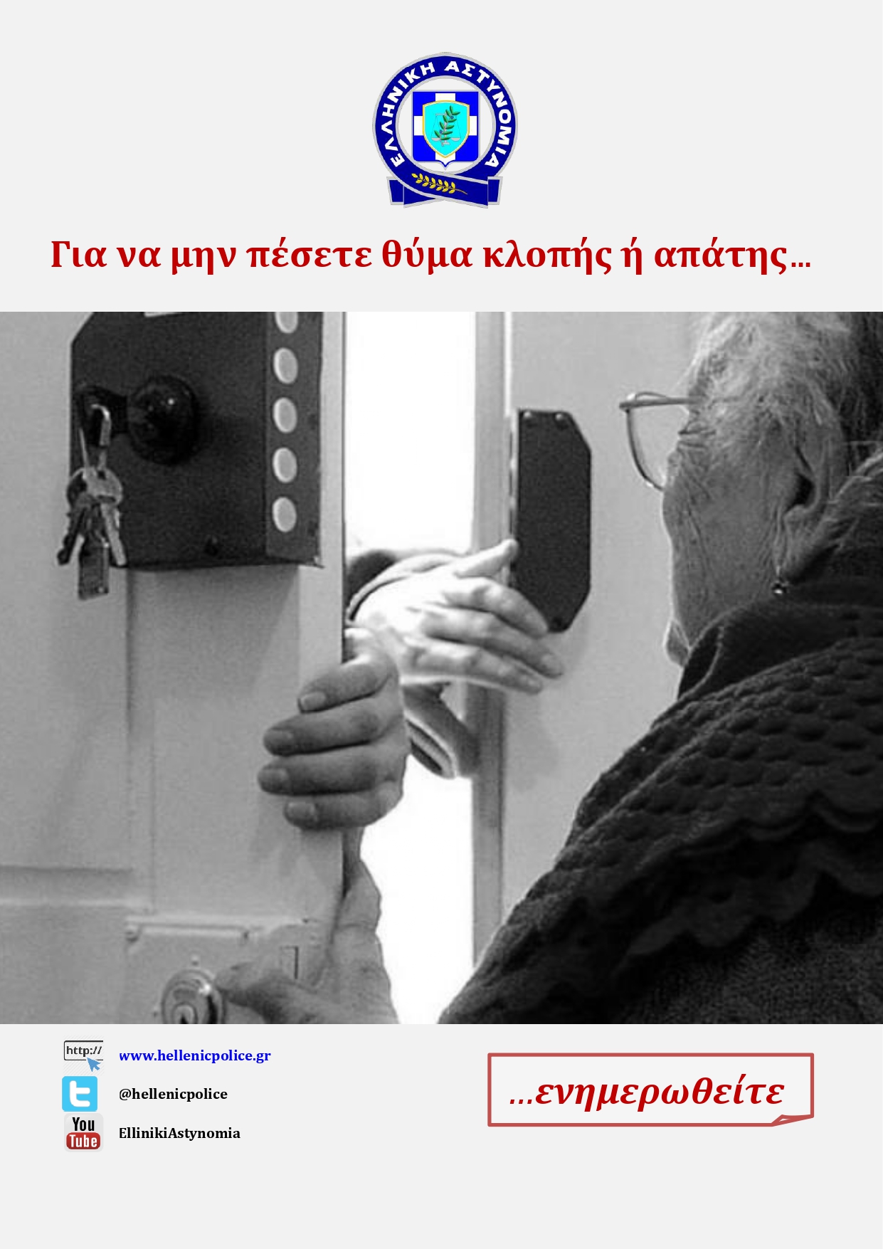 • Να ενημερώνετε τα οικεία σας πρόσωπα (του στενού και ευρύτερου συγγενικού, φιλικού και κοινωνικού περιβάλλοντος) και ιδιαιτέρως τα ηλικιωμένα άτομα σχετικά με το περιεχόμενο του παρόντος και να τους συμβουλεύετε σχετικά, προκειμένου να αποφευχθεί το ενδεχόμενο θυματοποίησης τους.